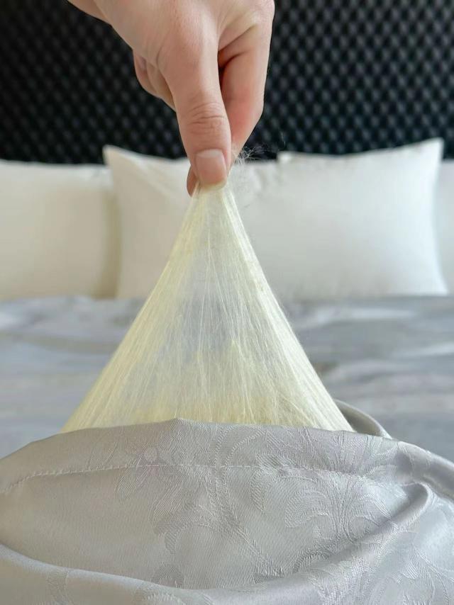 黃金桑蠶絲(70%)富含無數(shù)“絲容積空隙”,形成天然空氣流通層,能大量吸走身上汗氣,吸濕比純棉還好,再通過絲纖維通道高效排出,讓被窩整夜干爽。