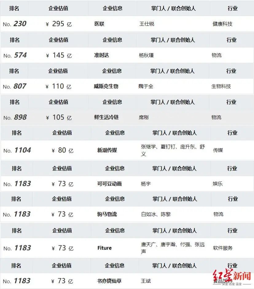 胡潤研究院的《2025全球獨角獸榜》列出全球2000年后成立、價值10億美元以上的非上市公司。全球1523家獨角獸企業(yè)上榜,成都的上榜企業(yè)有醫(yī)聯(lián)、準(zhǔn)時達(dá)、鮮生活冷鏈、駒馬物流、威斯克生物、新潮傳媒、書亦燒仙草、Fiture、可可豆動畫,主要分布在健康科技、物流、生物科技、傳媒、食品飲料、軟件服務(wù)、娛樂等行業(yè)。