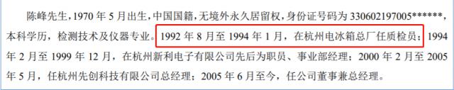 陳峰,1970年5月出生,中國國籍,無境外永久居留權(quán),本科學歷,檢測技術(shù)及儀器專業(yè)。他也有豐富的工作履歷,1992年8月至1994年1月,在杭州電冰箱總廠任質(zhì)檢員;1994年2月至1999年12月,在杭州新利電子有限公司先后為職員、事業(yè)部經(jīng)理;2000年2月至2005年5月,任杭州先創(chuàng)科技有限公司總經(jīng)理;2005年6月至今,任公司董事兼總經(jīng)理。