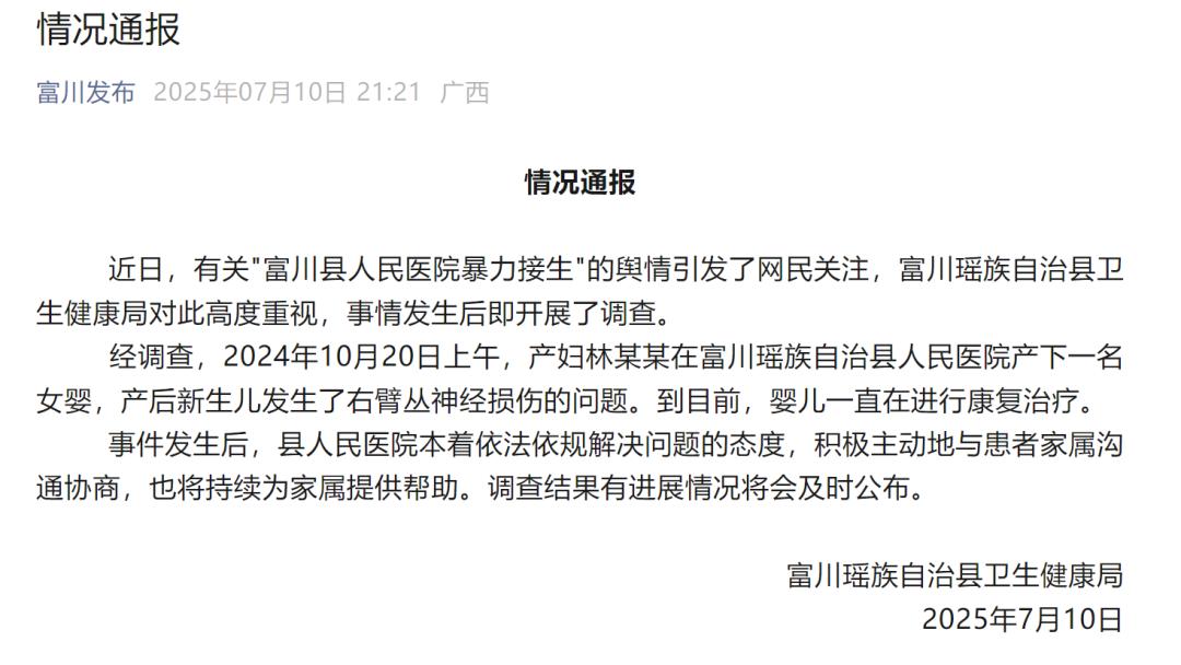 7月10日晚,富川發(fā)布了關(guān)于“富川縣人民醫(yī)院暴力接生”的情況通報。