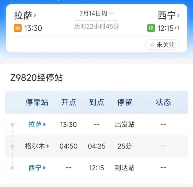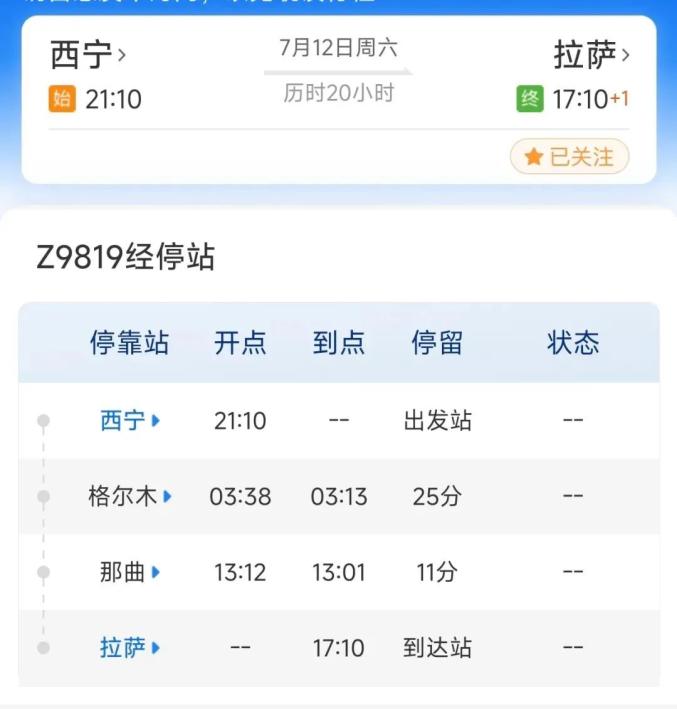 7月12日西寧至拉薩間Z9819次旅客列車運(yùn)行時(shí)刻及客運(yùn)辦理站如下: