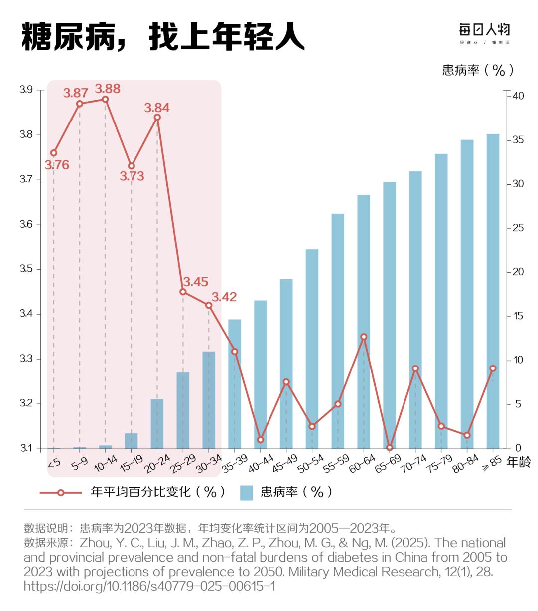 中國疾控中心慢病中心最新發(fā)布的糖尿病地圖顯示,截至2023年,10歲至14歲的未成年人,糖尿病患病率增速最高,年均增長高達(dá) 3.88%。