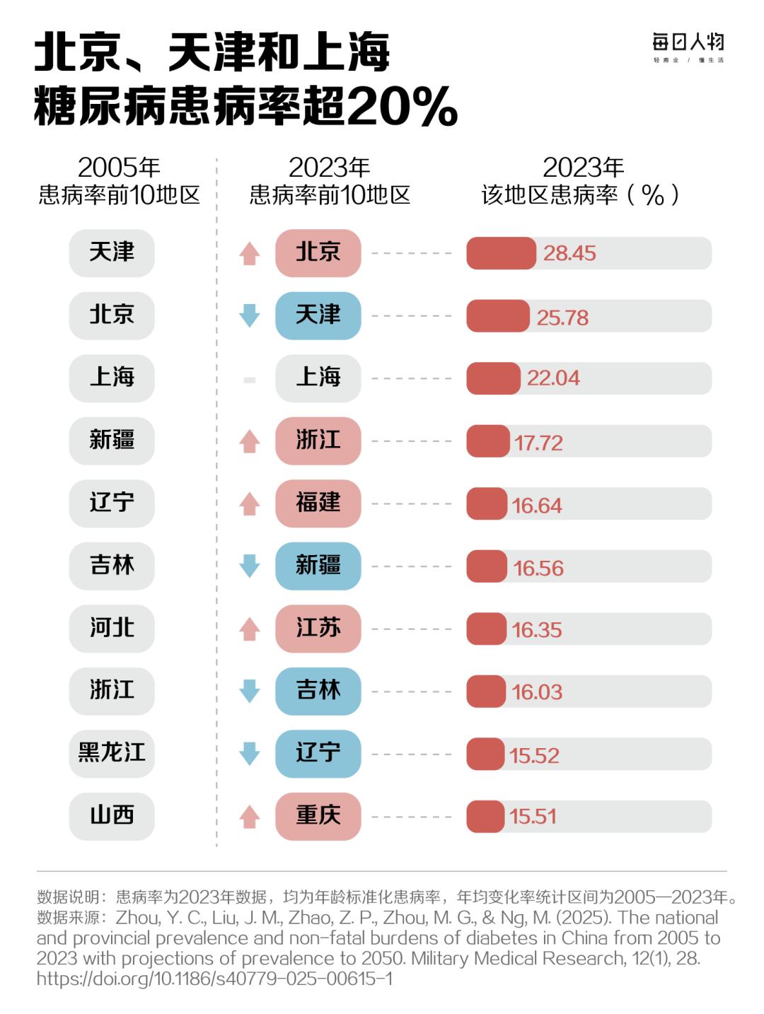 此外,糖尿病不同地區(qū)的患病率差異明顯,北方普遍高于南方。2023年,北京糖尿病患病率高達(dá)28.45%上升到第一名,天津、上海分別以25.8%和22.0%位列第二名和第三名。研究結(jié)果顯示,如果不能及時(shí)干預(yù)患病率,預(yù)計(jì)到2050年,北京和天津的糖尿病患病率將超過40%。