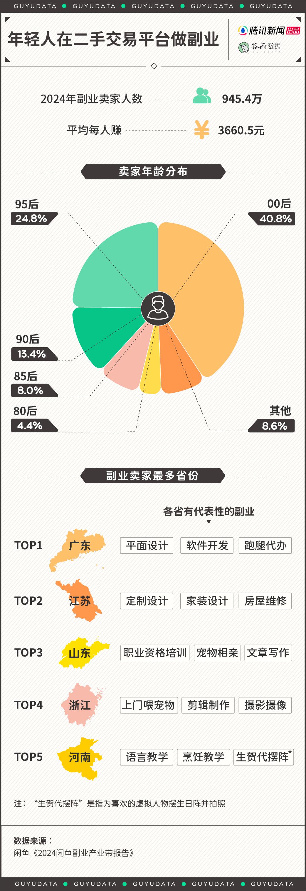 《2024閑魚副業(yè)產(chǎn)業(yè)帶報(bào)告》顯示,2024年共945.4萬年輕人在閑魚發(fā)布副業(yè),近八成為90后,00后占比40.8%。人均年收入3660.5元,其中最賺錢的副業(yè)是當(dāng)保安/保鏢,平均客單價(jià)達(dá)到660.7元。