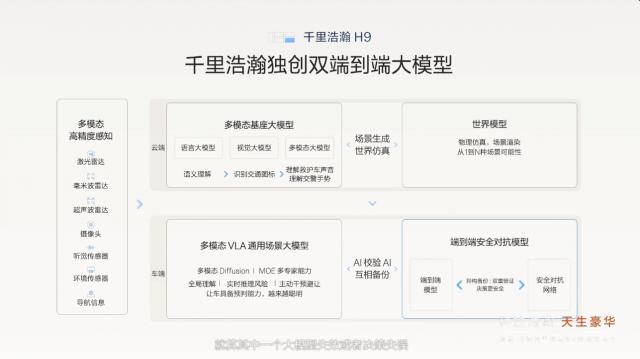 當(dāng)然,最終智駕體驗(yàn)好不好,關(guān)鍵看算法。千里浩瀚H9采用雙端到端大模型,云端有基座大模型和世界模型,車端有VLA通用大模型和端到端安全對抗模型。很多車企都在做類似的嘗試,極氪的優(yōu)勢在于多模態(tài),聽覺、視覺、觸覺都可作為智駕的判斷依據(jù),識別更多信息。目前,這套系統(tǒng)還像一塊大餅,可能在今年四季度落地,讓我們拭目以待。
