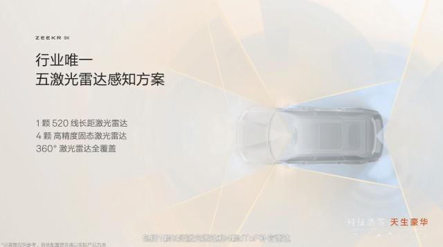 說完底盤,再說說智駕。9X用的是千里浩瀚智駕的H9版本(大概率低配是H7),有L3級的智駕能力。硬件方面,更新后的問界M9用了四顆激光雷達(dá),而極氪9X用了5顆,前面多了一顆固態(tài)激光雷達(dá),主要是為了擴(kuò)大視野、減少盲區(qū)。極氪還在主雷達(dá)上進(jìn)行了升級,用了一顆520線的長距激光雷達(dá),線越多分辨率越高,后期圖像處理更方便。同時,搭配雙英偉達(dá)Thor - U芯片,算力達(dá)到1400TOPS。