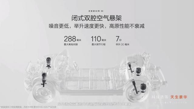 接下來看看9X好不好開,這就涉及到AI數(shù)字底盤了。在懸架系統(tǒng)方面,9X采用了閉式雙腔空氣懸架和雙閥CCD電磁減振器。閉式雙腔空氣懸架,小米YU7也在用?!半p腔”可單獨(dú)調(diào)節(jié)空懸軟硬,“閉式”舉升速度更快,調(diào)節(jié)30mm只需7秒,而一般的開式需要35秒。9X調(diào)節(jié)范圍達(dá)110mm,最大離地間隙能到288mm,能應(yīng)對一些復(fù)雜地形。