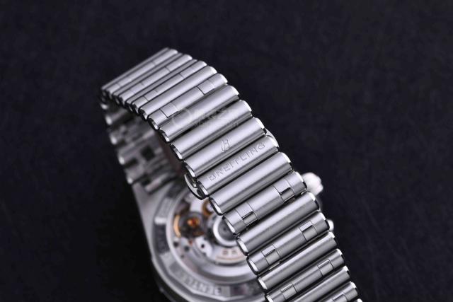 值得一提的是,這款腕表搭配的是輥珠精鋼表鏈,即百年靈標(biāo)志性的滾珠鏈表帶。與傳統(tǒng)鏈節(jié)不同,這種由多個(gè)半球形滾珠組成的鏈帶,舒適性和靈活性好,讓表更具機(jī)械感與個(gè)性。