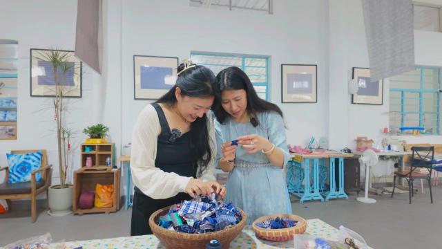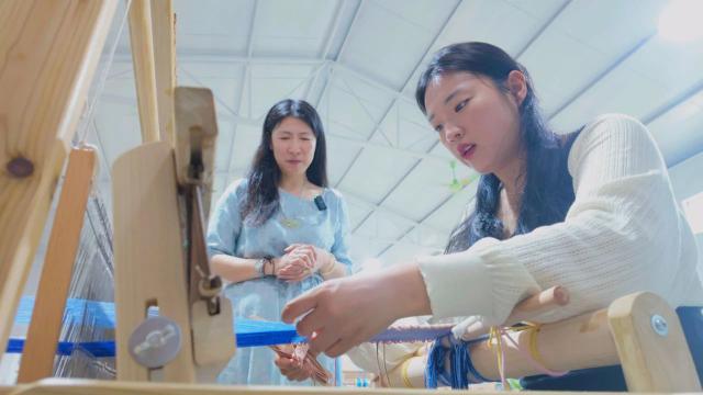 丁娘子技藝高超,她‘彈棉’時(shí)棉絮如飛花般輕盈。她織出的布質(zhì)地精良柔軟,被稱為‘丁娘子布’或‘飛花布’,曾是宮廷御用珍品。在布藝館內(nèi)的非遺傳承基地,游客既能了解這段輝煌歷史,還能體驗(yàn)非遺項(xiàng)目,如親手織布、染布等。姜欣怡在楊潘紅的指導(dǎo)下,體驗(yàn)了織布機(jī),感受非遺文化的魅力。