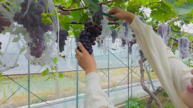 在藝術(shù)中心不遠(yuǎn)處,有個(gè)能體驗(yàn)田園樂(lè)趣、品嘗新鮮美味的好地方——奧德農(nóng)莊。這里種植著高品質(zhì)的新鮮水果,游客可以下地采摘,還能參與農(nóng)事勞作、食育課程等活動(dòng)。工作人員帶著姜欣怡體驗(yàn)了葡萄采摘、傳統(tǒng)醬油釀造等項(xiàng)目,讓她感受到鄉(xiāng)村生活的愜意與豐富。