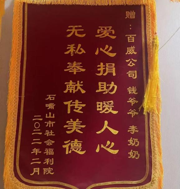 他們的善舉得到了受贈單位的回饋。2022年2月,石嘴山市社會福利院通過他們女兒所在公司為老兩口贈送錦旗表示感謝;今年4月,烏魯木齊的一家兒童福利院也送來錦旗,感謝他們的無私付出。兩面錦旗是遠方受助者的真誠感謝,也照亮了這對夫妻的公益之路。
