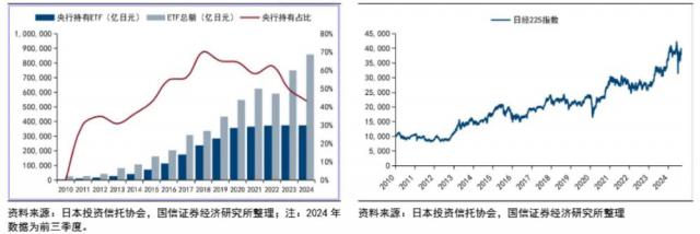 如圖所示,2010年從1萬點漲至2024年的4萬點左右,持續(xù)14年上漲,漲幅達3倍。這背后日本國家隊功不可沒,日本央行持有ETF占比從2010年的零一路升至高峰時超過70%,成為市場的關鍵力量。