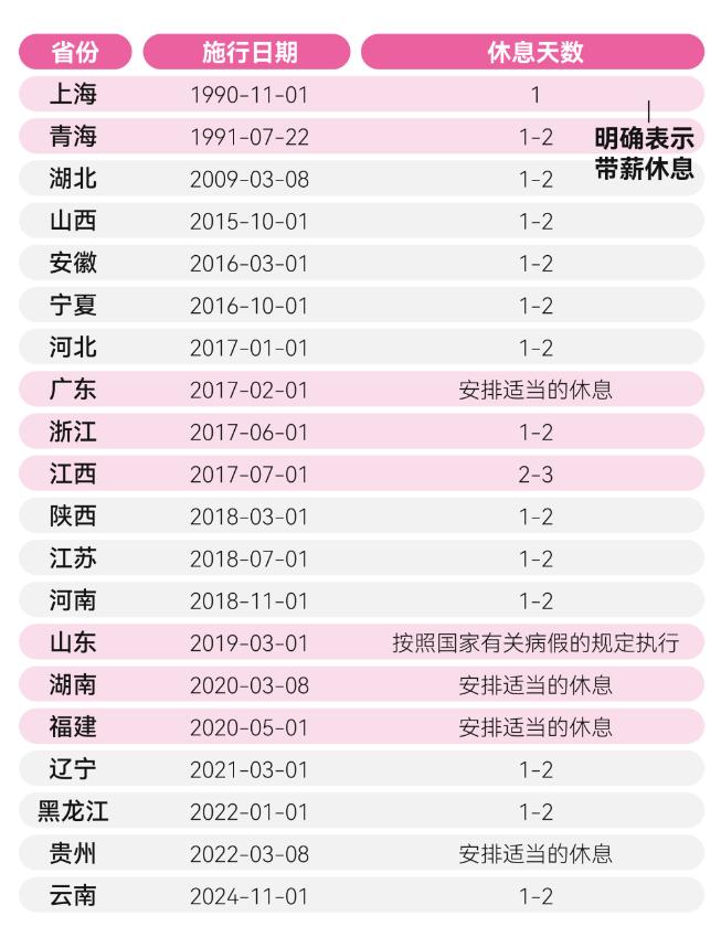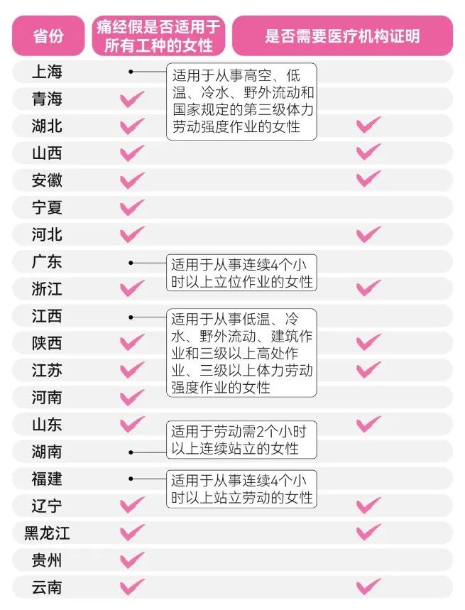 據(jù)統(tǒng)計(jì),目前全國(guó)約20個(gè)省市,如北京、上海、江蘇、廣東、浙江、云南等,在地方性規(guī)定中明確了女性勞動(dòng)者可休痛經(jīng)假,休息時(shí)間普遍為1至2天,最多3天。