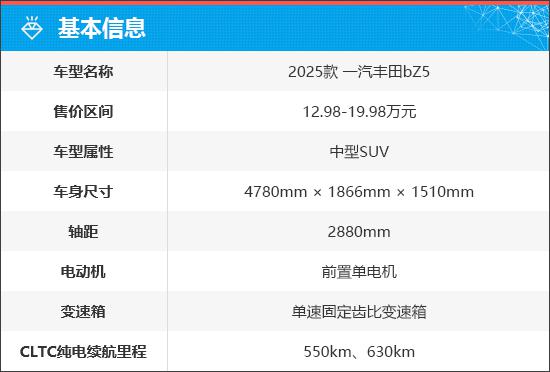 2025款一汽豐田bZ5共推出6款車型,售價區(qū)間為12.98 - 19.98萬元。新車定位為純電中型SUV,全系標配前置單電機,CLTC純電續(xù)航里程根據(jù)車型配置不同,分為550km和630km。