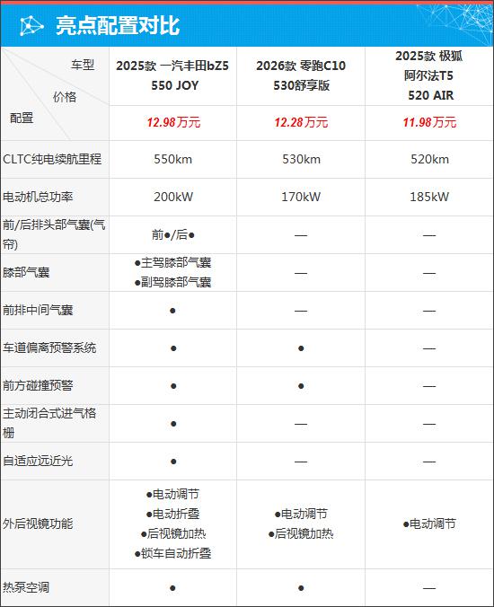 價格方面,極狐阿爾法T5的起售價最低,而頂配車型價格最貴的是一汽豐田bZ5。車型數(shù)量上,一汽豐田bZ5最多,為6款,零跑C10和極狐阿爾法T5均為5款。