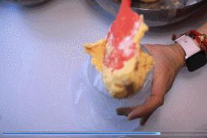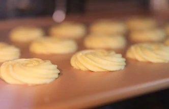 5. 倒入塑料袋,加上裱花模具,均勻地在烤盤(pán)上裱出曲奇形狀。