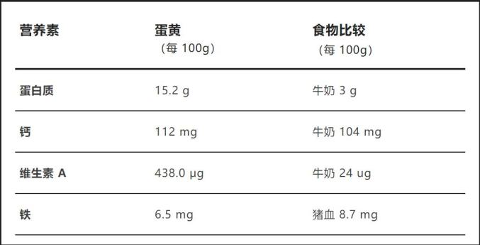 更重要的是,蛋黃富含多種營(yíng)養(yǎng)。通過(guò)下面這組對(duì)比能看出蛋黃的營(yíng)養(yǎng)價(jià)值: