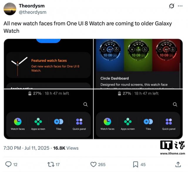 IT之家發(fā)現(xiàn),三星已悄然向Galaxy Watch7美版/韓版推送上述表盤。同時,參考消息源Theordsym,三星未來還會為舊款Galaxy Watch 4 - 6系列用戶推出這些新表盤。