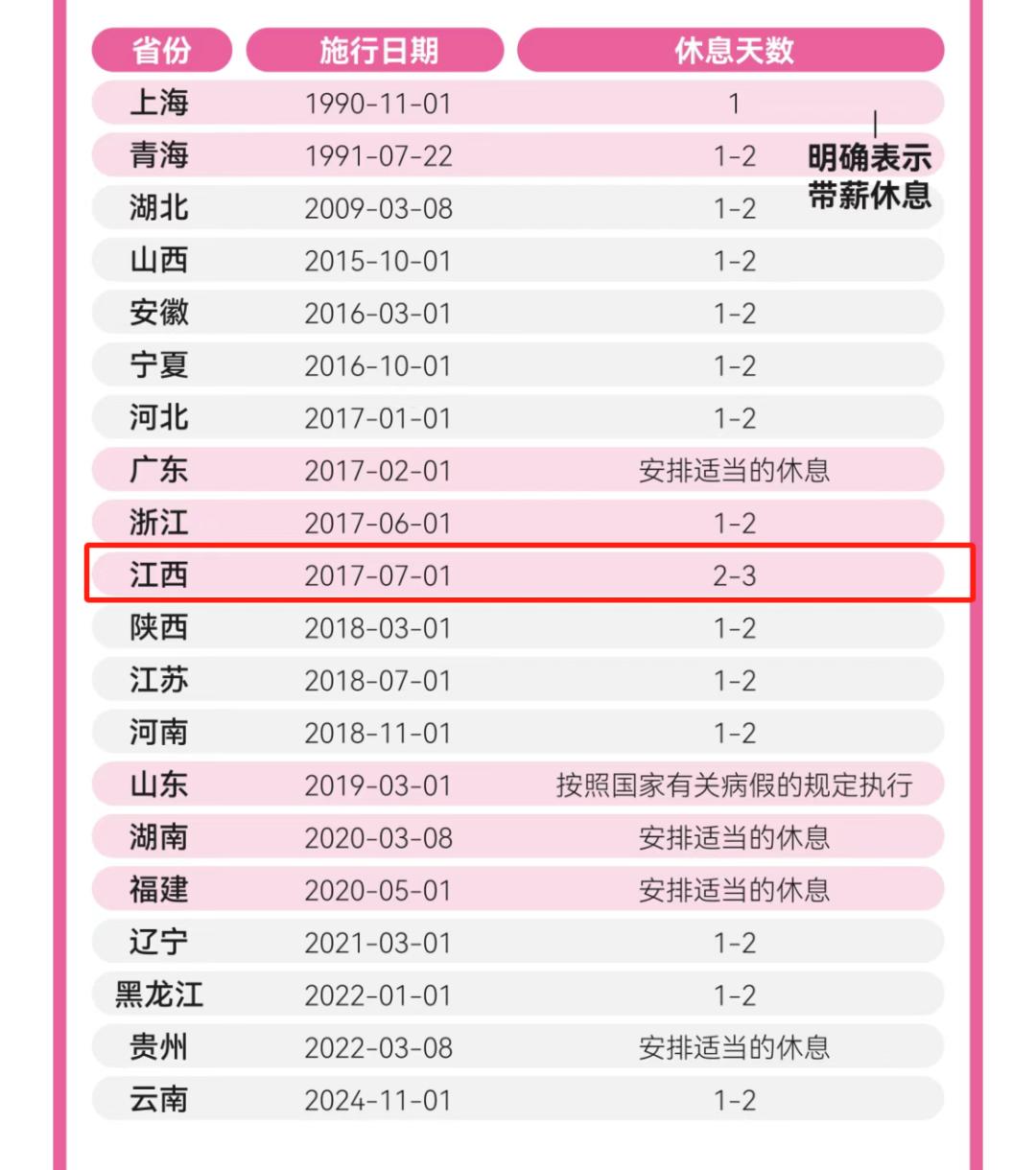 江西的“痛經(jīng)假”自2017年7月1日施行,天數(shù)為2 - 3天。