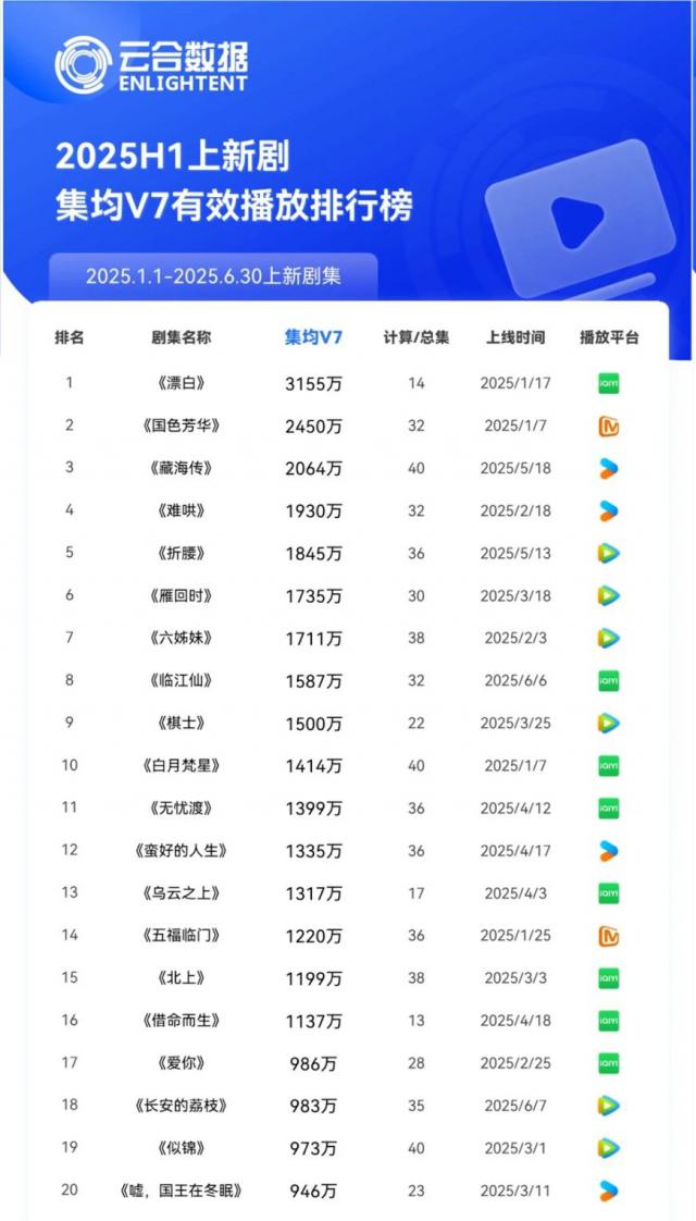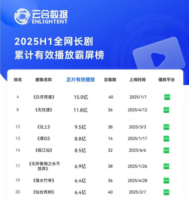 2025年上半年,愛(ài)奇藝在劇集市場(chǎng)播放表現(xiàn)亮眼。云合數(shù)據(jù)《2025上半年長(zhǎng)劇集網(wǎng)播表現(xiàn)與上新觀察》報(bào)告顯示,愛(ài)奇藝在累計(jì)有效播放霸屏榜、集均V30及V7有效播放、熱播期集均有效播放等多個(gè)榜單中,數(shù)量和質(zhì)量都領(lǐng)先。
