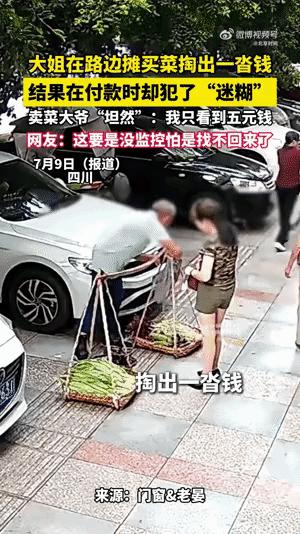 7月9日,在四川,一大姐在路邊攤買菜時掏出一沓錢付款,結果犯了“迷糊”,左手5元,右手2000多元,隨手付了2000多。之后再挑菜付款時發(fā)現(xiàn)沒錢了,賣菜大爺稱“只看到5元錢”。網(wǎng)友表示,若沒監(jiān)控怕是找不回錢了。據(jù)女子社交平臺回復,已報警找回。