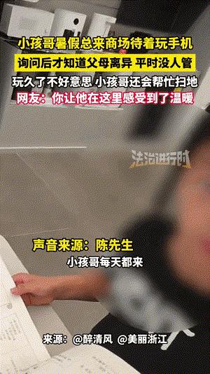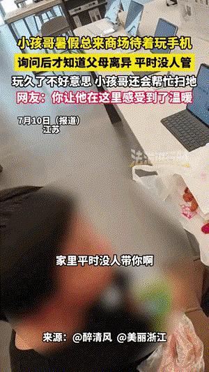 7月10日,江蘇一小孩暑假總在商場玩手機。經(jīng)詢問得知,男孩父母離異,平時沒人管。當事人陳先生稱,小男孩很乖,玩手機時還會幫忙掃地。熟悉后,陳先生讓他帶作業(yè)來,寫完再玩。