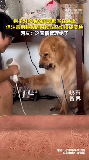 狗子對吹毛的厭惡都寫在臉上,注意到鏡頭時立馬切換成笑臉。