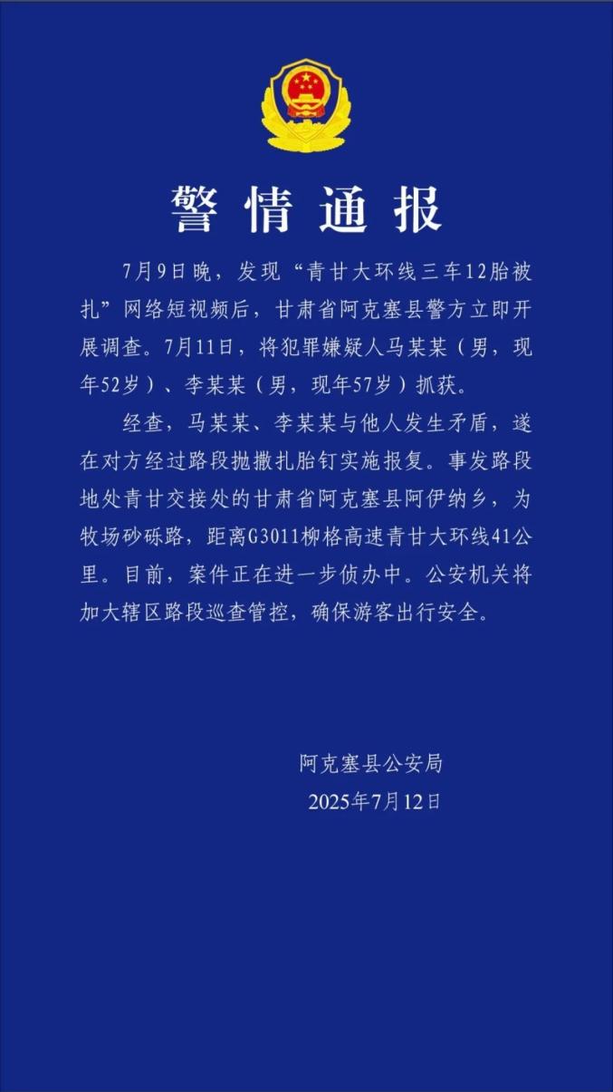 甘肅警方就“青甘大環(huán)線三車12胎被扎報廢”一事發(fā)布通報,犯罪嫌疑人馬某某(男,52歲)、李某某(男,57歲)已被抓獲,二人因與他人發(fā)生矛盾,拋撒扎胎釘實施報復。
