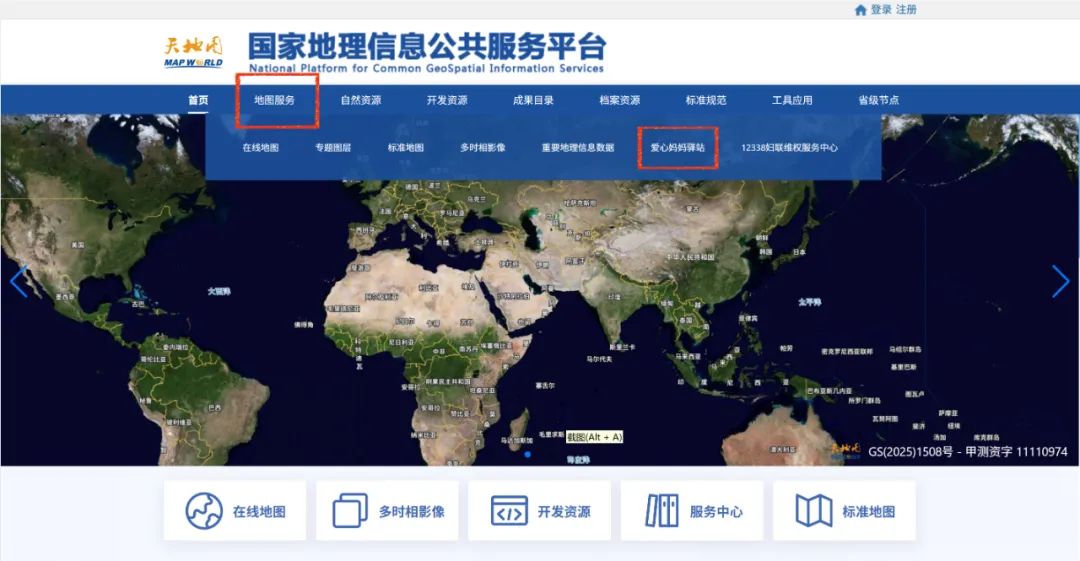 方式一:登錄國家地理信息公共服務平臺(天地圖)https://www.tianditu.gov.cn/,進入“地圖服務”,點擊“愛心媽媽驛站”。