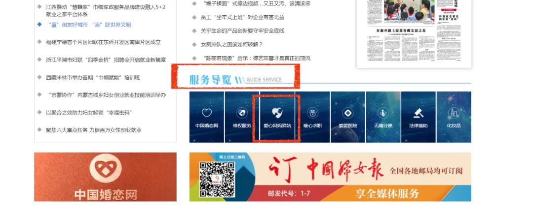 方式三:登錄中國婦女網https://www.cnwomen.com.cn/,進入服務導覽,選擇“愛心媽媽驛站”。
