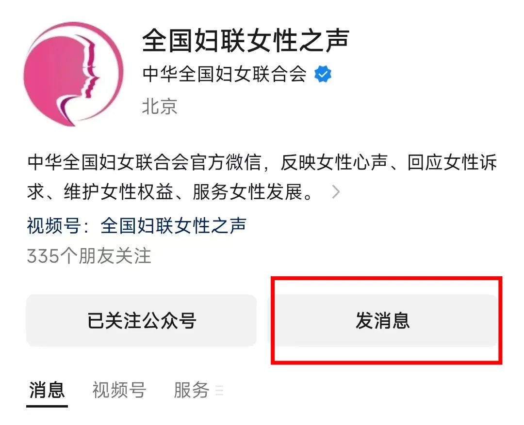 方式二:關注全國婦聯(lián)女性之聲微信公眾號,點擊發(fā)消息,