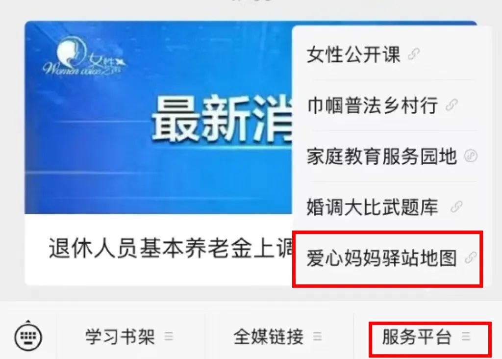 點擊右下角服務平臺,選擇“愛心媽媽驛站地圖”。