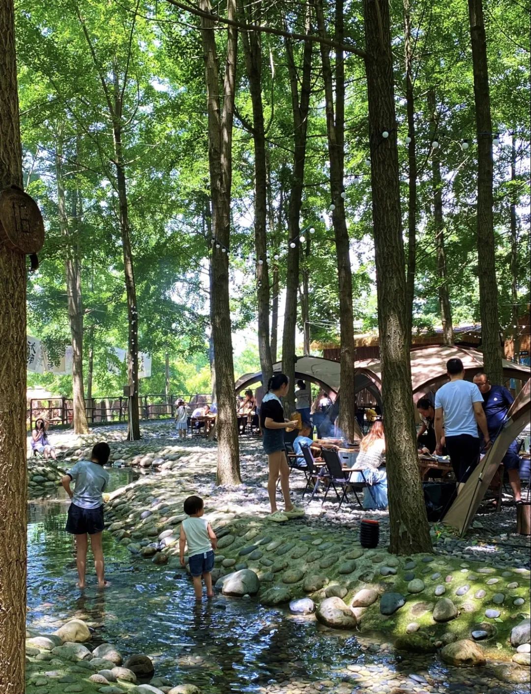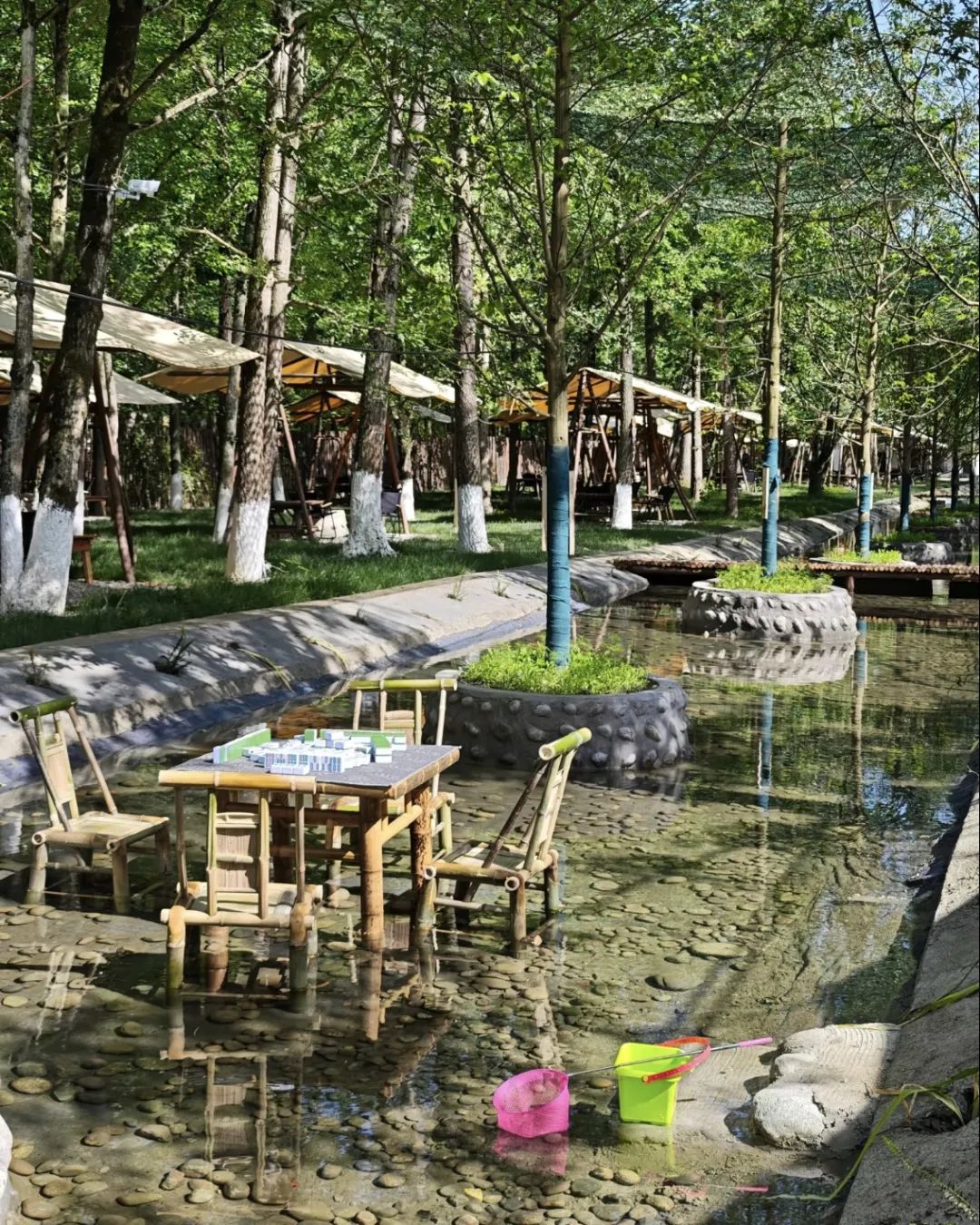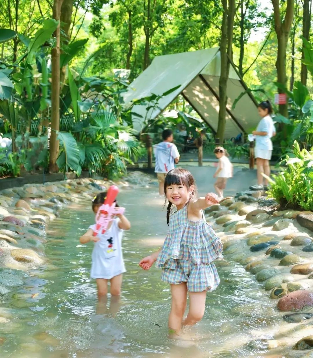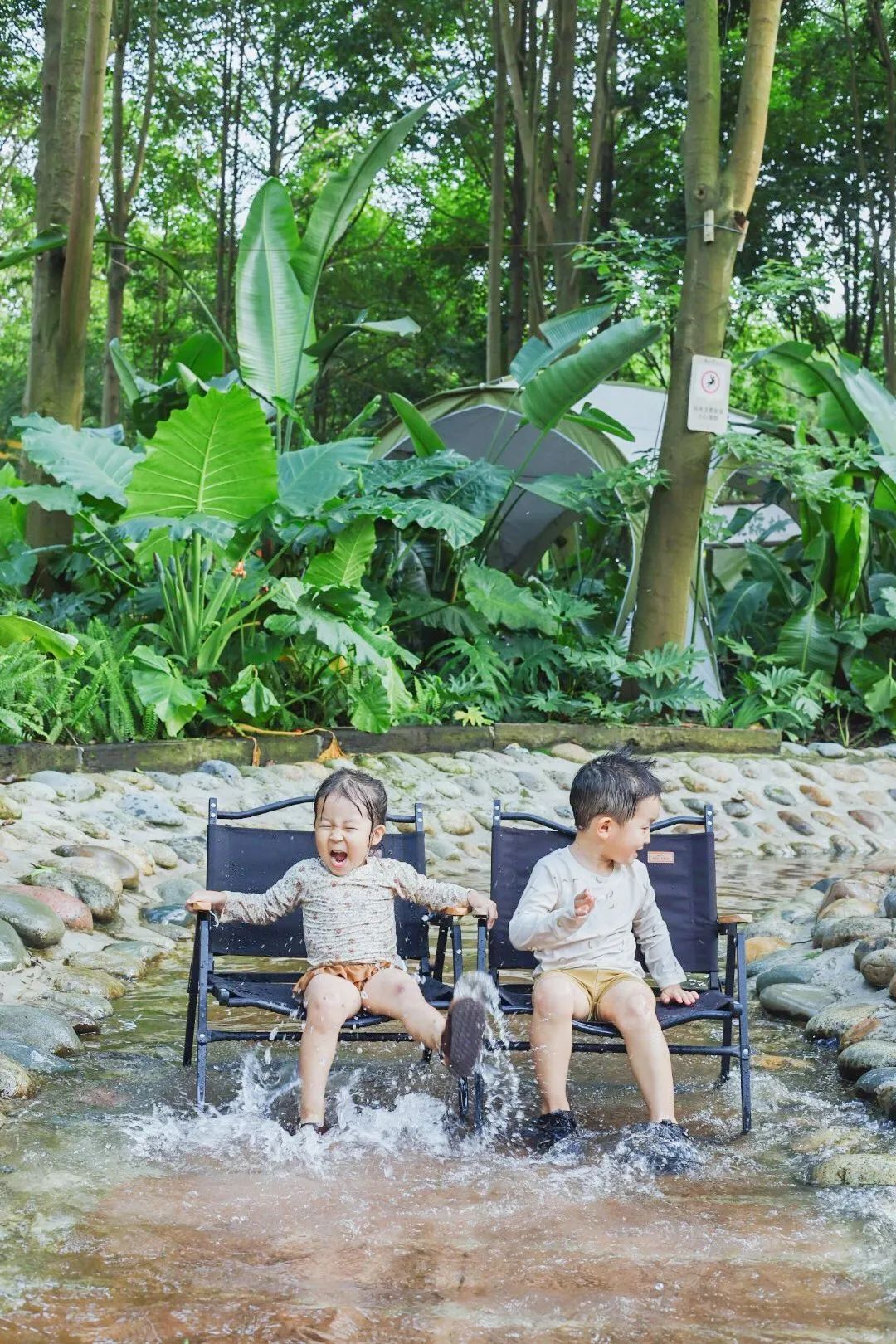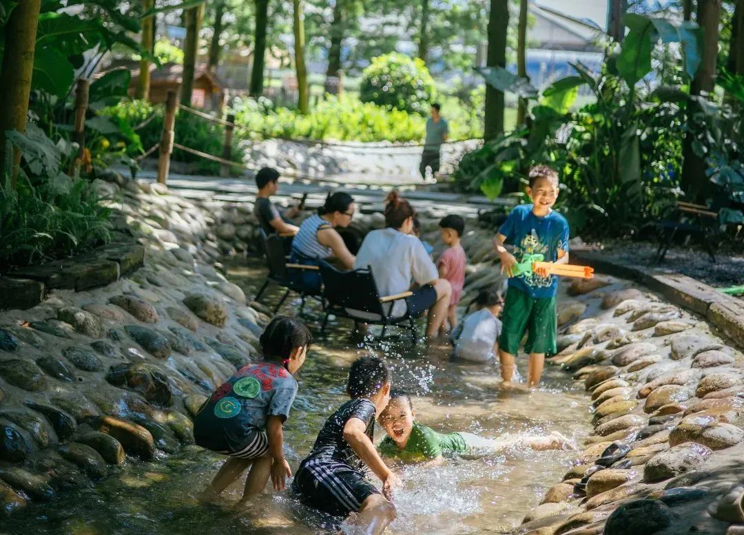 溪流淺灘區(qū)水深僅過腳踝,孩子們可以搬螃蟹、打水仗,家長(zhǎng)在岸邊“觀戰(zhàn)臺(tái)”喝茶放空。