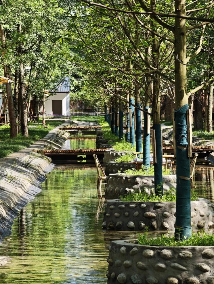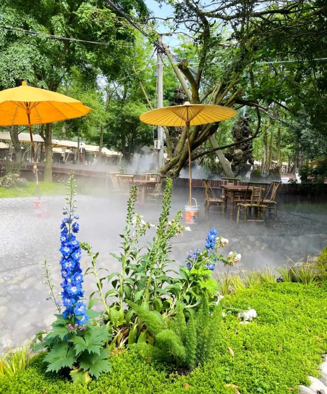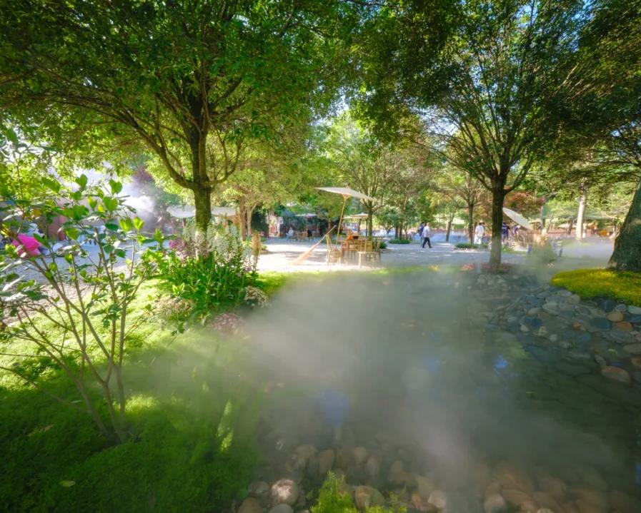 鹿?fàn)柣▓@位于溫江和盛魯家灘,園區(qū)內(nèi)頭頂是密不透光的巨型“綠傘”,腳下是沁涼青草毯和小溪,光腳踩進(jìn)去像踩進(jìn)“流動(dòng)的冰箱”,每隔幾分鐘還有仙氣水霧降溫,十分清涼。