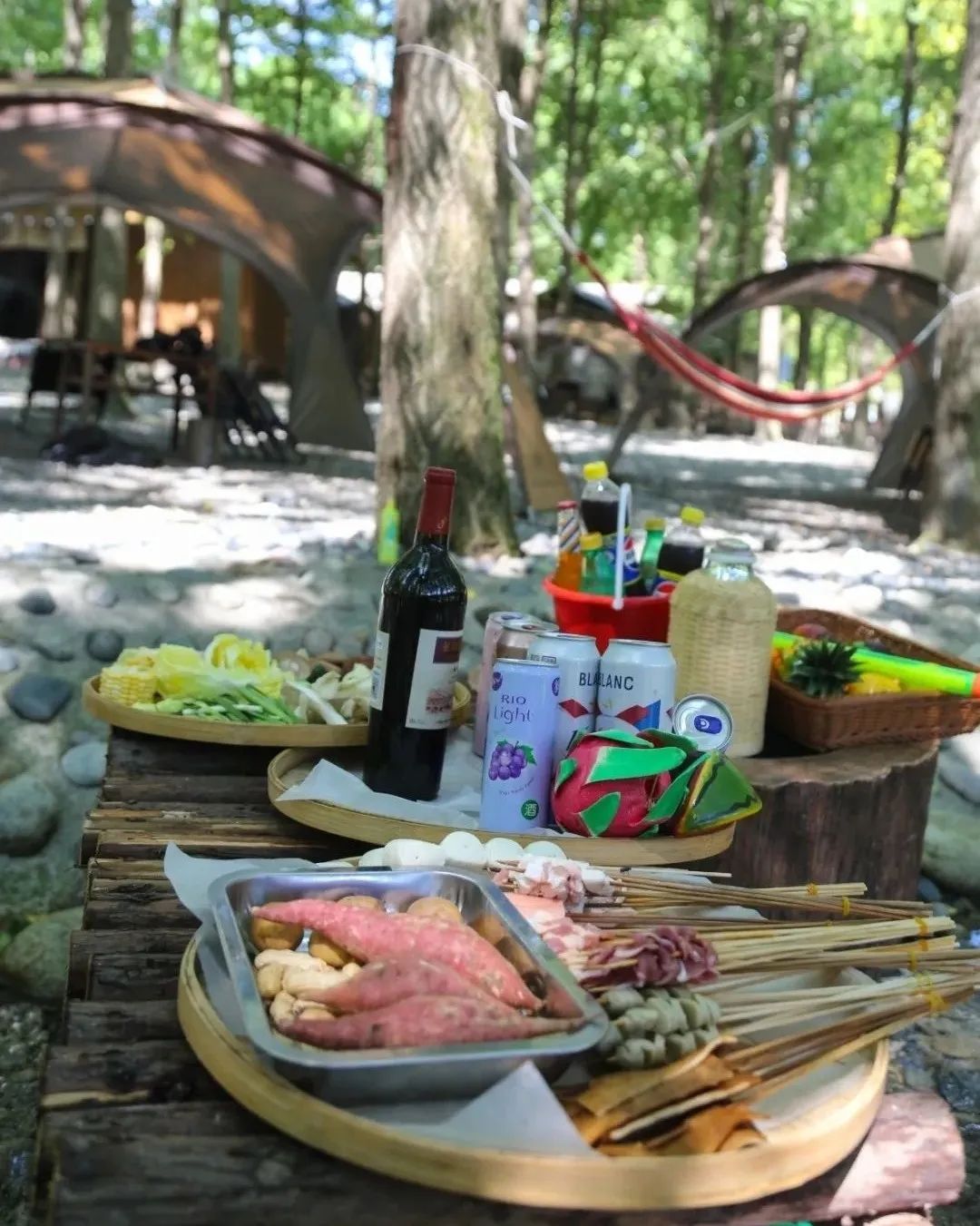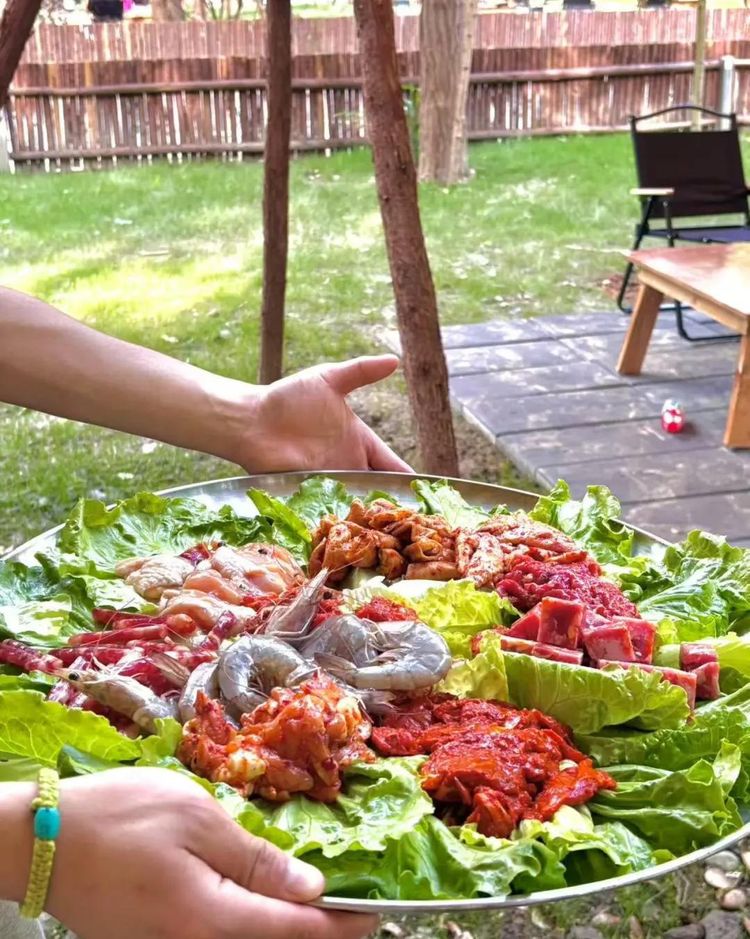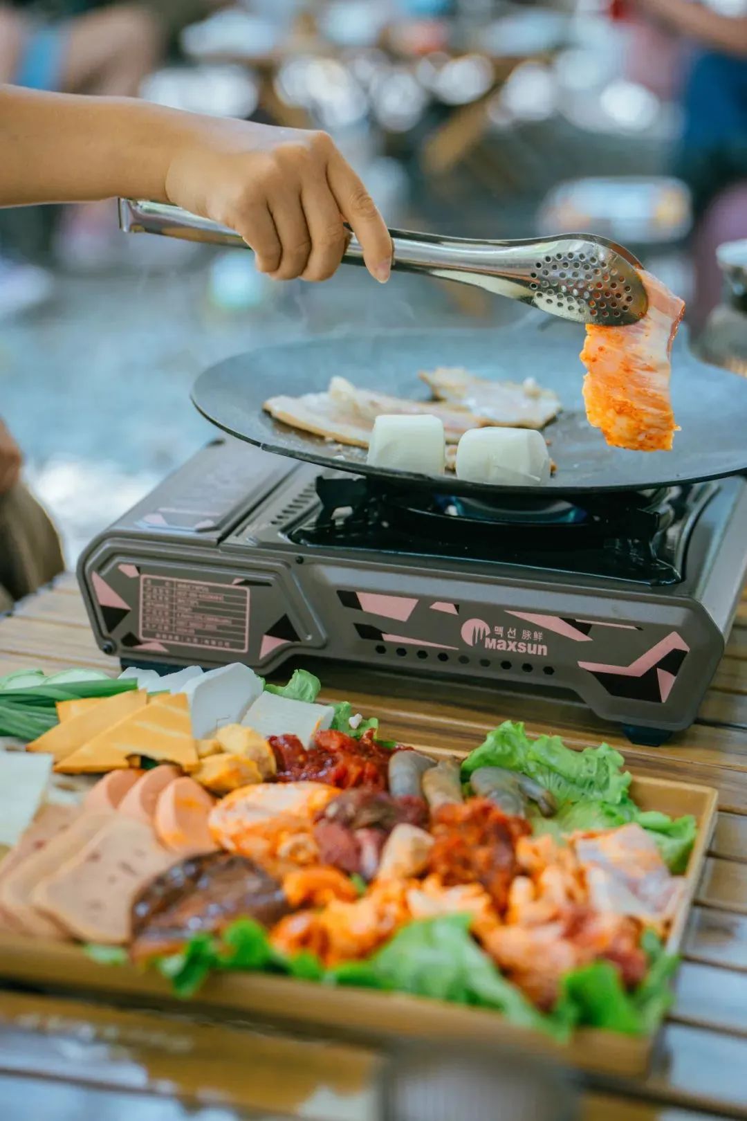 耍累了,就到溪邊的自助烤肉區(qū),精品五花肉、秘制鮮嫩牛肉等著你,聽著美食“滋滋”作響,親手烹飪美食的過程簡(jiǎn)直是一種享受。