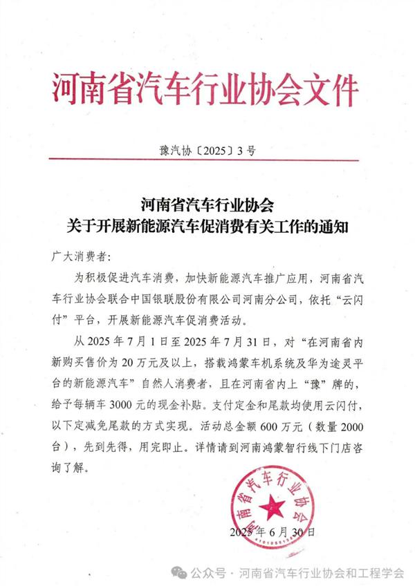 2025年7月1日至2025年7月31日,對(duì)在河南省內(nèi)新購(gòu)買(mǎi)售價(jià)為20萬(wàn)元及以上,搭載鴻蒙車(chē)機(jī)系統(tǒng)及華為途靈平臺(tái)的新能源汽車(chē)的自然人消費(fèi)者,且在河南省內(nèi)上“豫”牌的,給予每輛車(chē)3000元的現(xiàn)金補(bǔ)貼?;顒?dòng)總金額600萬(wàn)元(數(shù)量2000臺(tái)),先到先得,用完即止。