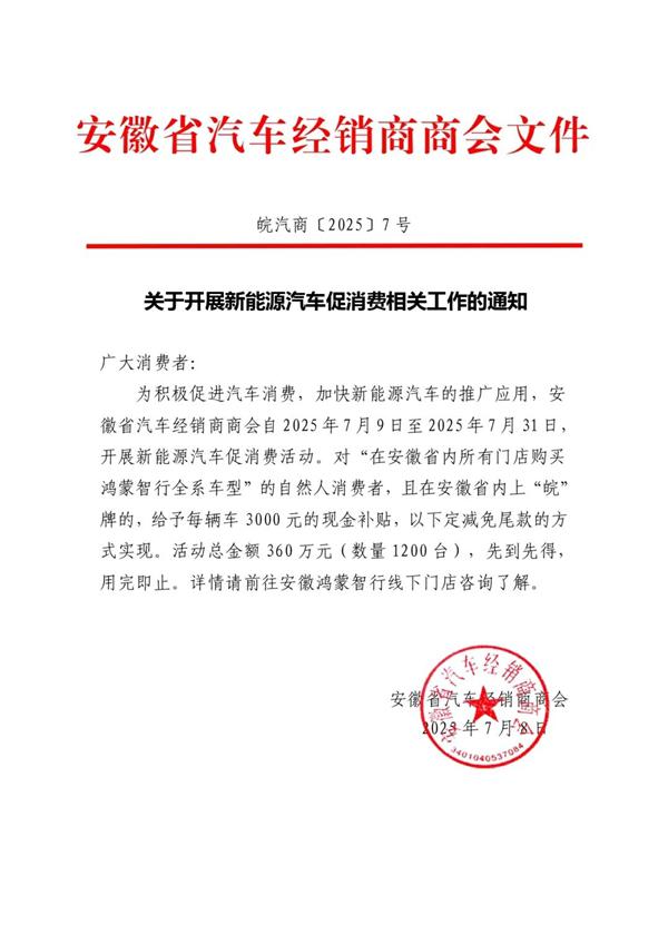 安徽汽車(chē)經(jīng)銷(xiāo)商商會(huì):7月31日前購(gòu)鴻蒙智行每車(chē)補(bǔ)貼3000元