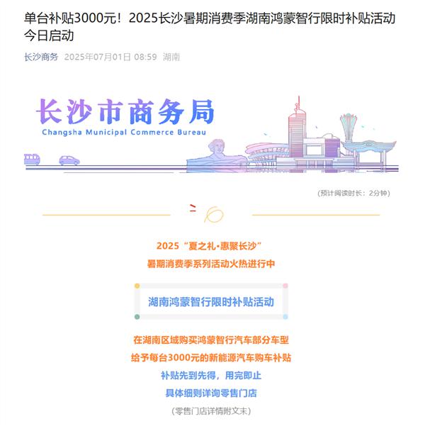 7月2日,“長(zhǎng)沙商務(wù)”官宣湖南開(kāi)啟鴻蒙智行限時(shí)補(bǔ)貼活動(dòng),在湖南區(qū)域購(gòu)買(mǎi)鴻蒙智行汽車(chē)部分車(chē)型,給予每臺(tái)3000元的新能源汽車(chē)購(gòu)車(chē)補(bǔ)貼。