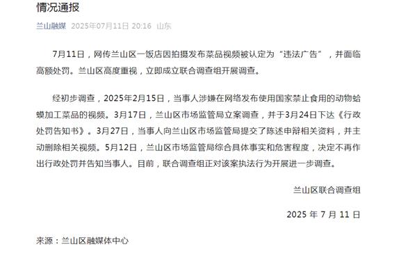 7月11日,網(wǎng)傳蘭山區(qū)一飯店因拍攝發(fā)布菜品視頻被認(rèn)定為“違法廣告”,并面臨高額處罰。蘭山區(qū)高度重視,立即成立聯(lián)合調(diào)查組開(kāi)展調(diào)查。