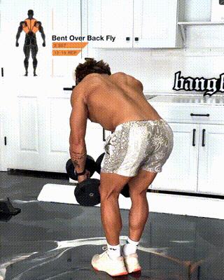 動作要領(lǐng):站直,膝蓋微彎,臀部向后撅起,身體俯身接近水平狀態(tài)(腰背一定要挺直?。kp手握住啞鈴,掌心相對,自然下垂。借助肩后和上背的力量,將啞鈴向身體兩側(cè)平舉打開(如同飛鳥展翅),舉到肩膀高度或略高。在最高點停留片刻,然后慢慢下放。