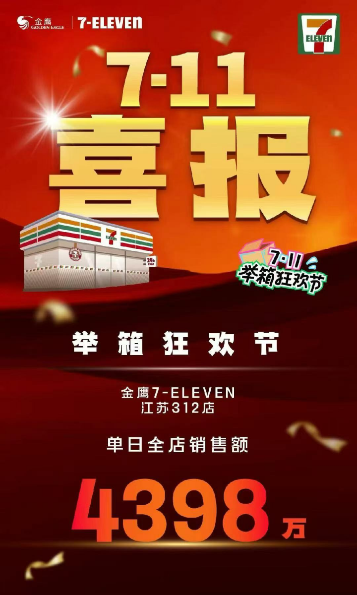 7月11日,一年一度的金鷹7 - Eleven“舉箱狂歡節(jié)”在江蘇全省熱鬧開場。全省13個城市的300多家門店共同發(fā)力,取得了驚人的成績:單日營業(yè)額達(dá)到4398萬元,全店客流量高達(dá)45.9萬人次,平均單店銷售額為14萬元,單店最高銷售額更是達(dá)到29萬元,多項數(shù)據(jù)都創(chuàng)下了新的紀(jì)錄。
