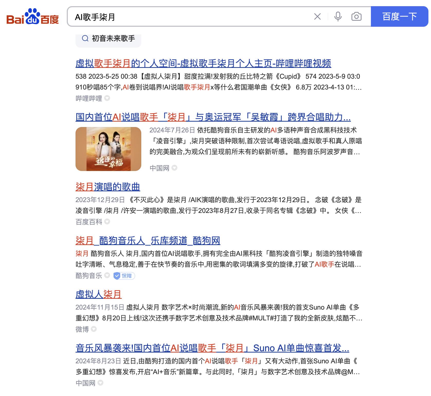 現(xiàn)階段AI歌手未獲普遍認(rèn)可,酷狗的柒月有騰訊資源,在亞運(yùn)賽事、端午節(jié)有公開表演機(jī)會(huì),人氣仍不高。百度搜索「柒月」,首頁難見AI歌手柒月信息,加關(guān)鍵詞后搜到的多是幾個(gè)月到一年多前的內(nèi)容。