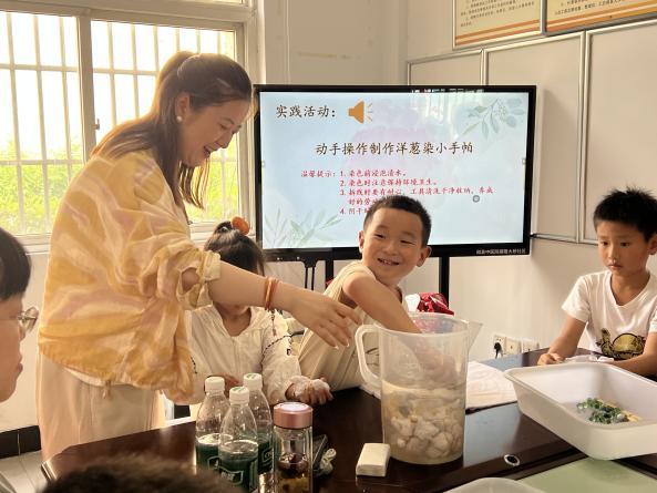 如果說洋蔥取色是大自然的饋贈,那么扎染技藝就是人類智慧的結(jié)晶?;顒又?,施老師現(xiàn)場指導,教孩子們用“洋蔥染”的天然色素,為白色手帕染上彩色。
