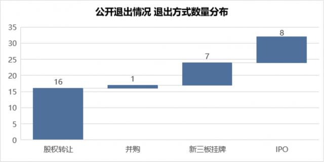 從退出情況來(lái)看,本周共有 32 個(gè)公開(kāi)退出案例,與上周持平;其中,股權(quán)轉(zhuǎn)讓 16 個(gè),較上周減少 1 個(gè);并購(gòu) 1 個(gè),較上周減少 8 個(gè);新三板掛牌 7 個(gè),較上周增加 5 個(gè); IPO 8 個(gè),較上周增加 4 個(gè)。