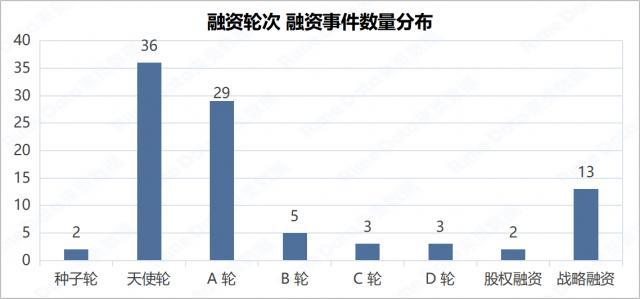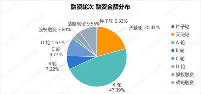 從融資輪次的事件數(shù)量分布來(lái)看,本周天使輪和 A 輪融資事件合計(jì)達(dá) 59 起;戰(zhàn)略融資排名第三,為 13 起;本周早期融資(A 輪及以前)融資事件數(shù)合計(jì)占比 58.33%,較上周有所下降。融資金額方面,本周 A 輪占比最高,達(dá) 47.39%;其次是天使輪,融資金額占比達(dá) 20.41%。整體而言,本周融資輪次的分布集中度較上周大幅前移。