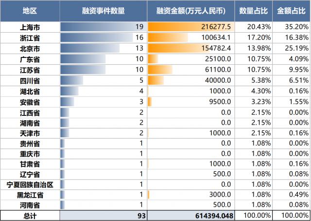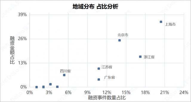 本周地域分布上,融資事件數(shù)量前五的地區(qū)是上海市、浙江省、北京市、廣東省和江蘇省,前五地區(qū)合計(jì)發(fā)生融資事件 68 起,占所有融資事件數(shù)量總和的 73.12%,地域集中度較上周有所增加。融資金額方面,前五的地區(qū)為上海市、北京市、浙江省、江蘇省以及四川省,前五地區(qū)融資金額合計(jì) 57.25 億元,占所有融資總額的 93.23%,融資金額上地域集中度較上周有所增加。