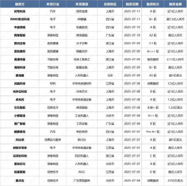1. 具身智能:07 月 08 日消息,它石智航近日完成 1.22 億美元天使 + 輪融資。本輪融資由美團(tuán)領(lǐng)投,臨港科創(chuàng)投、國(guó)汽投資、賽富投資基金、碧鴻投資、襄禾資本、線性資本、建發(fā)新興投資、重慶鈞山投資管理咨詢有限公司共同參與。融資將用于打造具身數(shù)字引擎 Human - Centric 等全棧技術(shù)體系,拓展生態(tài)與場(chǎng)景資源,還啟動(dòng)了全球頂尖人才招募計(jì)劃。它石智航是一家由 AI 驅(qū)動(dòng)的具身智能技術(shù)公司,具備具身智能大模型能力、本體研發(fā)能力和軟硬一體產(chǎn)品量產(chǎn)能力。
