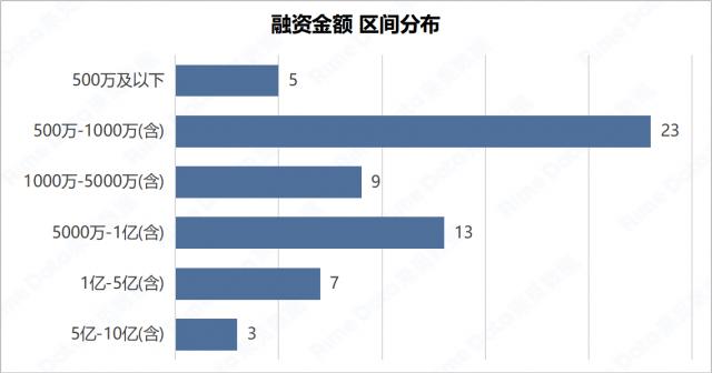 本周已披露金額的融資事件 60 起,比上周少 10 起,融資金額區(qū)間分布結(jié)構(gòu)較上周有所前移。本周 500 萬(wàn)以下的融資事件 5 起,和上周相同;500 萬(wàn) -1000 萬(wàn)(含 1000 萬(wàn))融資事件合計(jì) 23 起,比上周多 1 起;1000 萬(wàn) -5000 萬(wàn)(含 5000 萬(wàn))融資事件為 9 起,比上周少 4 起;5000 萬(wàn) -1 億(含 1 億)的融資事件 13 起,比上周少 5 起; 1 億 -5 億(含 5 億)的融資事件 7 起,比上周少 2 起;5 億 -10 億(含 10 億)的融資事件 3 起,比上周多 1 起;此外,本周沒(méi)有 10 億元以上融資事件,上周有 1 起。