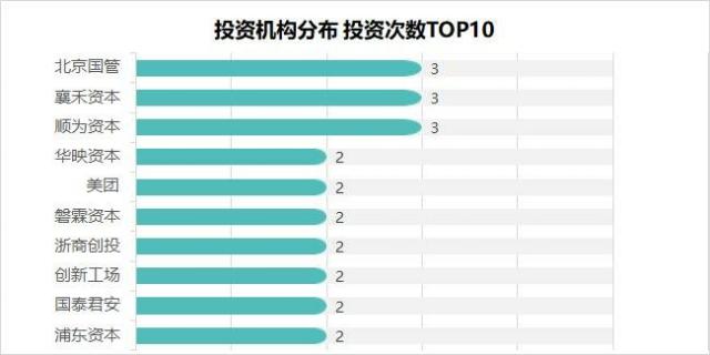 從機(jī)構(gòu)投資活躍度來(lái)看,本周共有 124 家投資機(jī)構(gòu)參與投資,合計(jì)出手 142 次。其中,北京國(guó)管(3 次)、襄禾資本(3 次)和順為資本(3 次)在創(chuàng)投市場(chǎng)中較為活躍,華映資本、美團(tuán)、磐霖資本、浙商創(chuàng)投、創(chuàng)新工場(chǎng)、國(guó)泰君安、浦東資本等機(jī)構(gòu)出手次數(shù)皆達(dá)到 2 次。