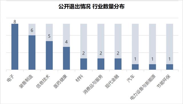 從行業(yè)分布來(lái)看,本周退出案例共涉及 10 個(gè)行業(yè),較上周減少 2 個(gè)。退出案例數(shù)量最多的行業(yè)為電子與裝備制造,信息技術(shù)排名第三,三大行業(yè)合計(jì)退出案例 19 個(gè),占總案例數(shù)的 59.38%。